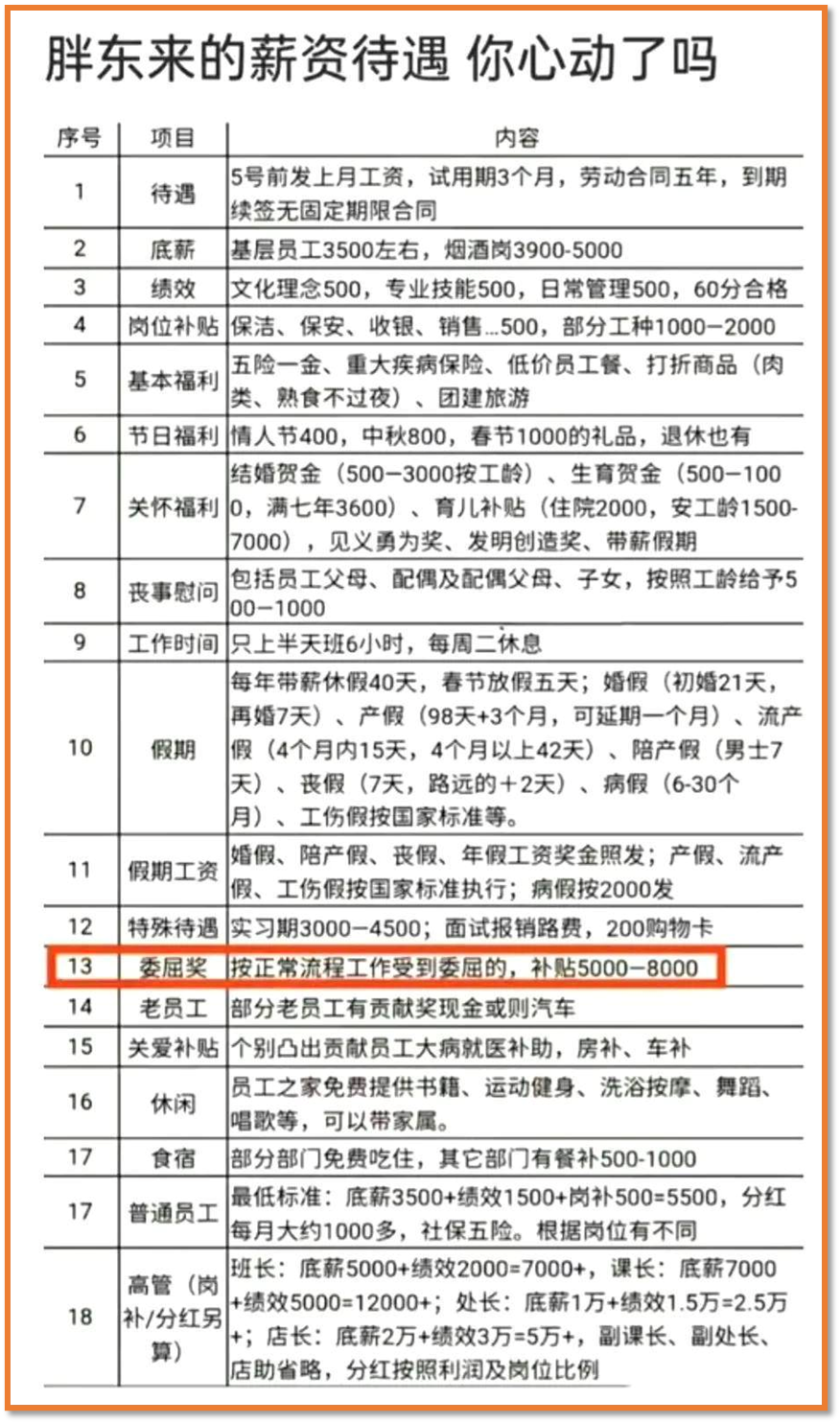 **更難得的是,它們還活成了打工人的夢想職場。**這當中最有名的是胖東來,因給員工頒發“委屈獎”而頻上熱搜。員工在這裏打工有三多,工資多、假期多、奔頭多。