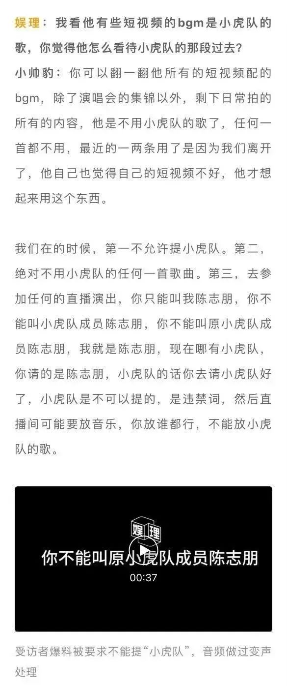 在採訪中他還透露,陳志朋不希望工作人員提到小虎隊這個名字,似乎對自己的過去很是介懷,哪怕陳志朋以個人名義去參加任何大型商演演出,但是絕不允許被説是前小虎隊成員,而必須是陳志朋個人名義。