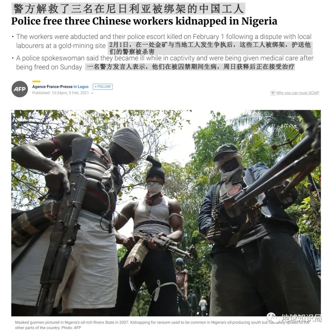 2021年2月,三名中國籍僱員在尼日利亞一個金礦開採糾紛中被綁架,他們的警察隨扈被打死。