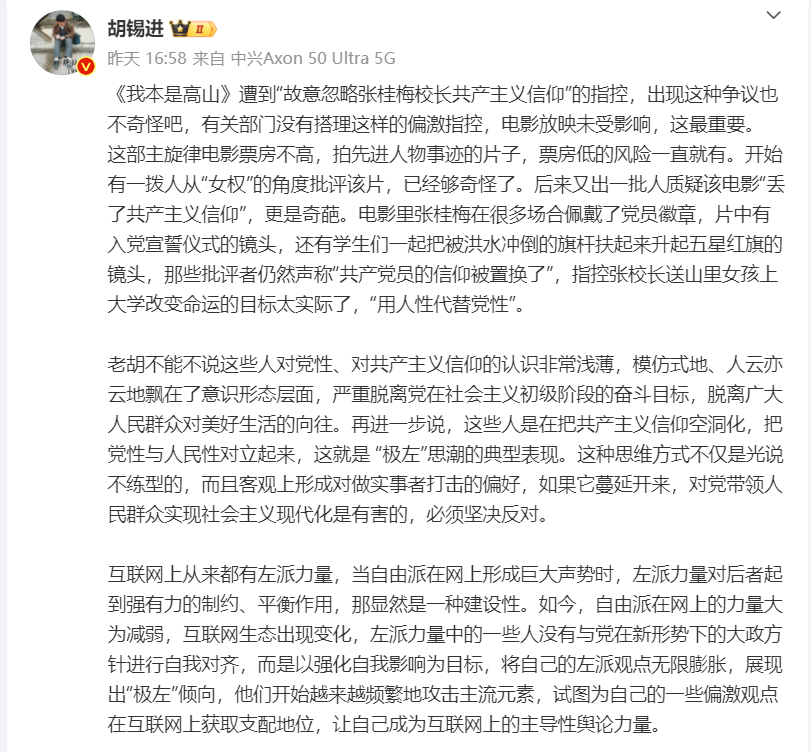 胡錫進認為網上有這麼多指責這部電影言論,就是極左思潮如今太氾濫了。
