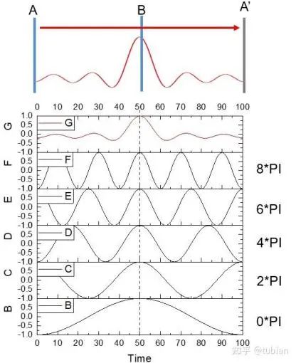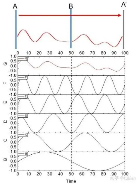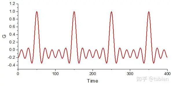 顯然,這並不是我們想要的。但試想一下,如果我們能通過一些操作,將不同的模“平移”,比如我們將時間50處,5個模都平移為波峯,就得到了這樣的結果: