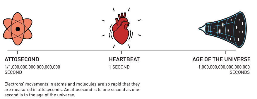 一阿秒等於10^-18秒,一秒內包含多少個阿秒,宇宙大爆炸到如今的138億年裏就有多少秒?有感覺了吧!