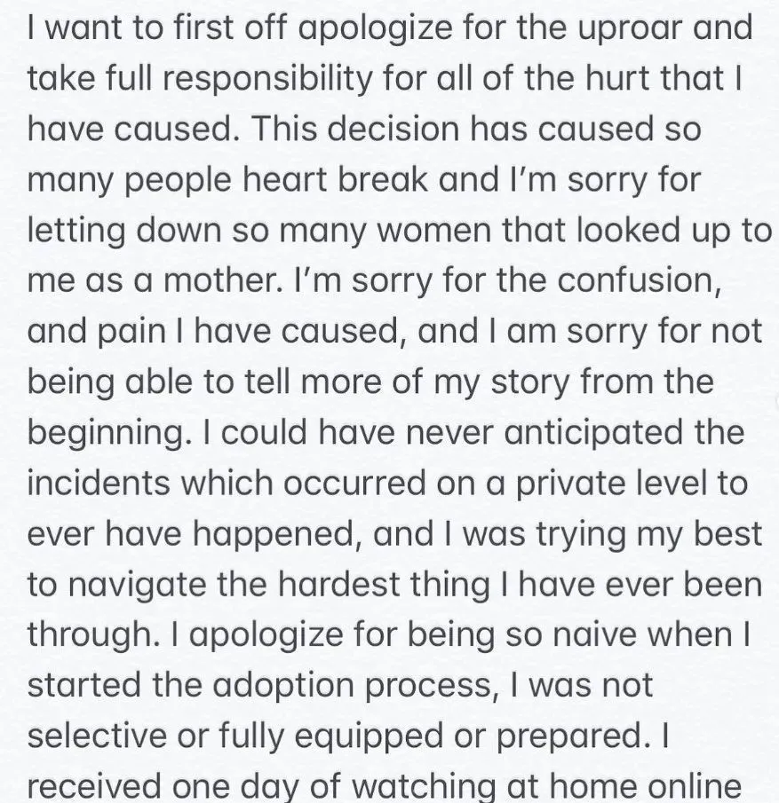 Myka 更改了她的社交媒體資料,悄悄改成了她是四個孩子的母親,而不是五個,刪除了有關Huxley的內容。她後來在社媒上為自己開始收養過程時“太天真”而道歉。“我沒有充分的做好準備。“
