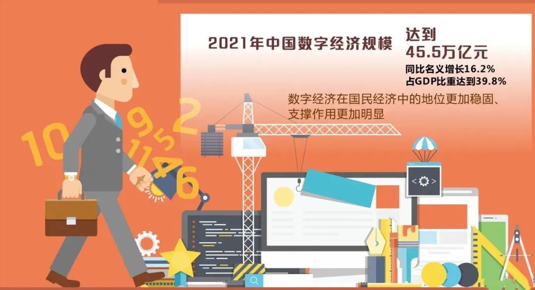 ▲2021年我國數字經濟規模達到45.5萬億元,總量穩居世界第二。數據來源:中國信通院。