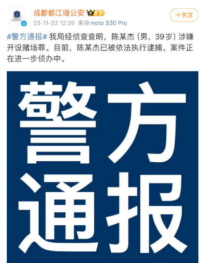 隨着2023年11月22日,成都都江堰公安發博證實鬥魚創始人陳某傑涉嫌開設賭場罪並被依法執行逮捕,不禁給坊間傳聞的真實性再次加碼。