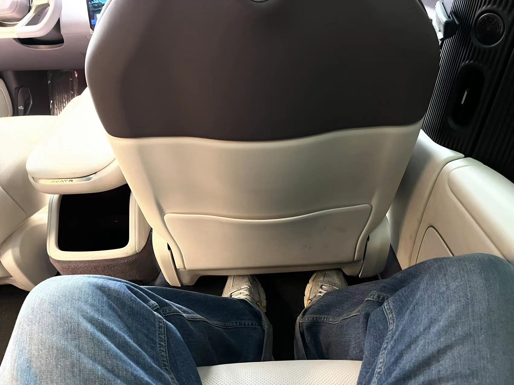 而阿維塔12的後排,只能説湊合,前排調整到坐的舒服的位置後,後排坐着膝蓋離前面一拳半。對一個C級車來説這算不上空間很好,只能説還算湊合。倒是Z軸縱向空間還行,地板較深腿不必蜷起來,座椅可以充分支撐大腿。換夫人來感受後排,作為身高不足160的較小南方姑娘,坐進去後和我表示這後排空間屬於“還行”算不上很大。而且她提出一個很有意思的點,一個是這車地板放的挺低座位也低,坐進去後感覺坐在地板上一樣;一個是車門玻璃位置比較高,導致她需要把頭探起來才能看到窗外,而且坐後排啥都看不到包括前面,給人一種小孩坐車的感覺。