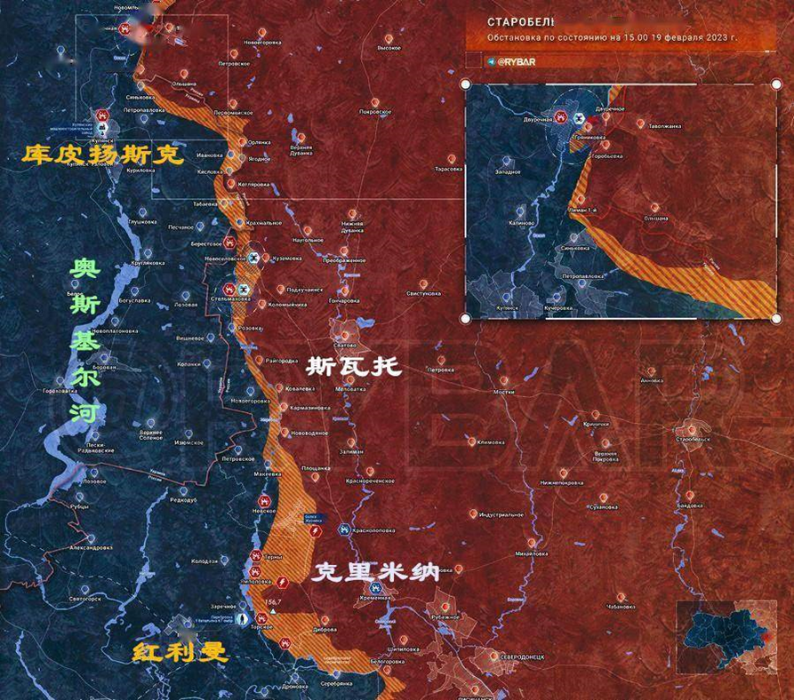 在紅利曼方向,盧甘斯克戰線也沒有顯著變化。俄軍第20集團軍的第3、第144摩托化步兵師,第25集團軍第67摩步師、164摩步旅和第11獨立坦克旅,與烏軍的第21、第24、第44、等63機械化步兵旅和第12“亞速”特種旅正在克里米納對峙(12)。集結如此重兵集團卻沒有大的動作,使人不禁聯想起去年俄軍伊久姆集團的類似行為。不過,中部軍區部隊在此緊盯着第12特種旅狠揍,迫使其兩次撤出前線整補,為此俄國防部七次表揚了該軍區的相關部隊。