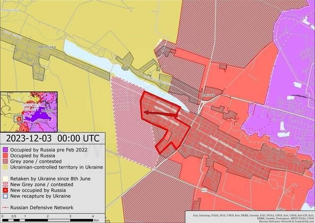 截止2023年12月1日,俄軍南北兩翼合圍圈的最短距離只剩下三公里左右(8)。從8km、7 km、4 km到此時的3km,守城烏軍的處境看來已經相當不妙!此時俄軍在南北兩翼的斯捷波韋、貝爾蒂奇與塞韋爾內、託南卡等地與烏軍展開激烈急奪的實質,也就是旨在實現戰役合圍,基本切斷城內守軍的主要補給通道。