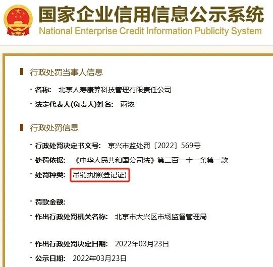 2022年3月23日,北京市大興區市場監督管理局對康養科技管理下發行政處罰決定書,因涉嫌成立後無正當理由超過6個月未開業,或開業後自行停業連續6個月以上,依據《公司法》第二百一十一條第一款,吊銷其執照。