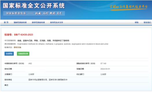 全國刑事技術標準化技術委員會在進一步豐富優化該項行業標準檢測分析方法、細化完善有關技術要求的基礎上,組織制定了《血液、尿液中乙醇、甲醇、正丙醇、丙酮、異丙醇和正丁醇檢驗》(GB/T 42430—2023)國家標準。