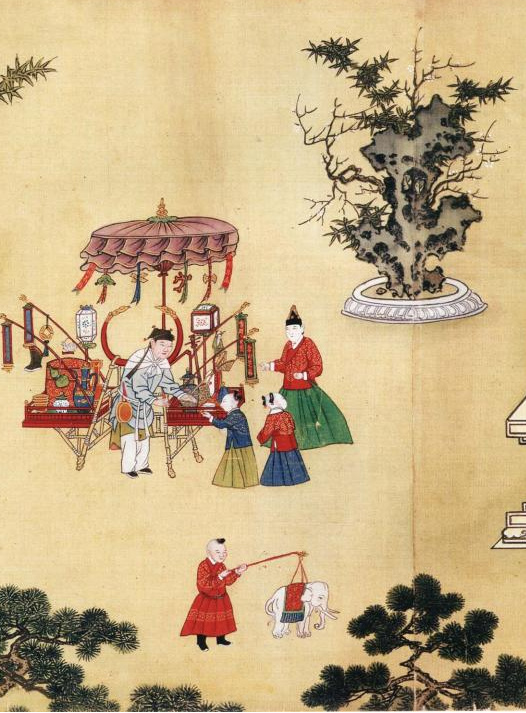 歷朝的貨郎畫作風格各異,但幾乎都有一個共同點,那就是圍繞着畫作的主角——貨郎和他琳琅滿目的貨架,總有一羣簇擁着選購的兒童。