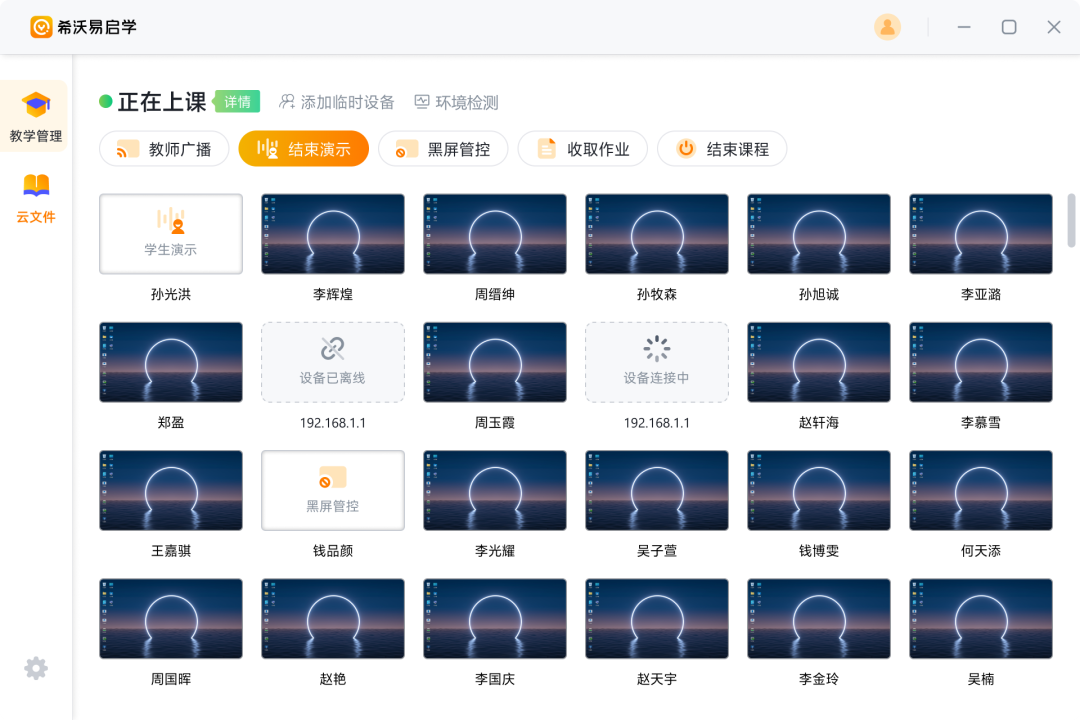 希沃同樣考慮到了這一點,自主研發了教室設備集中管理軟件“學校集控”,通過該系統,學校無需部署服務器,便可以實現遠程對教室平板、廣播、燈光等智能設備統一管理,實時監測教室連接集控的智能設備,包括使用情況、硬件參數、終端狀態。並且,學校集控後台功能可以根據具體需求自定義增刪。