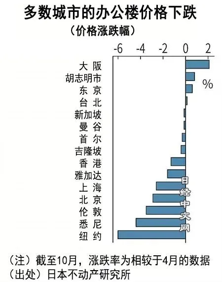紐約和倫敦10月的辦公樓租金也處於不變∼下跌0.1%的區間,看不到需求恢復的苗頭。