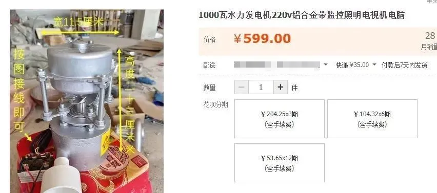 就這種東西,懟一根110的PVC管子,接在瀑布上游的水源裏,就可以發電,點個電燈什麼的沒問題。
