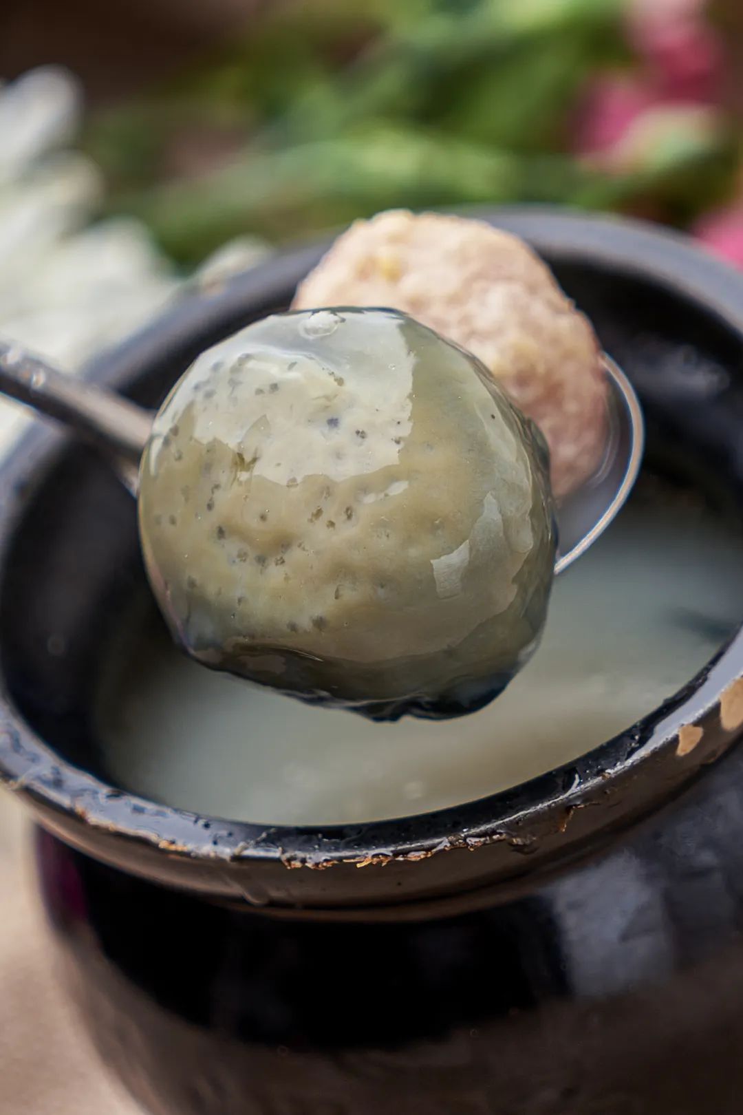 今天,在南昌街頭,常常能看到“瓦罐煨湯”的大字出現在小店的牌坊上。走近一點,無論多小多破舊的店門口都無一例外地立着一口巨大的瓦罐,上有雕龍,頗有一種鎮店的氣勢。售賣瓦罐煨湯的小店品類不多,光是各色肉餅湯,就佔到整個菜單的大半。有墨魚肉餅湯、蝦仁肉餅湯、雞蛋肉餅湯等等。半個手掌大的肉餅是事先做好的,放在黑黢黢的瓦缽底下,食客點單之後,店主把各色添頭放在肉餅上,然後從缽沿注入水,依照食客口味加入鹽和胡椒,最後放進大蒸籠裏旺火蒸熟。