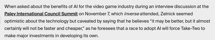 另外,對這次預告期待值最高的可能還有AI的表現力,毫無疑問,《GTA6》NPC動作流暢度與人物AI水平斷層式領先。R 星母公司Take-Two 的 CEO Strauss Zelnick 在一次採訪中提到,認為基於 AI 的遊戲 NPC“很有趣”,並聲稱 Take-Two 將和其他廠商一樣,對 AI 技術加大投資力度。
