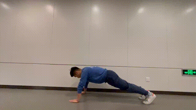 雙腿向後方快速伸直,然後屈肘完成一個標準的俯卧撐。快速收回雙腿,恢復到蹲姿,然後蹲起並順勢向上方起跳,雙手可以向上摸高,落地後維持站姿。