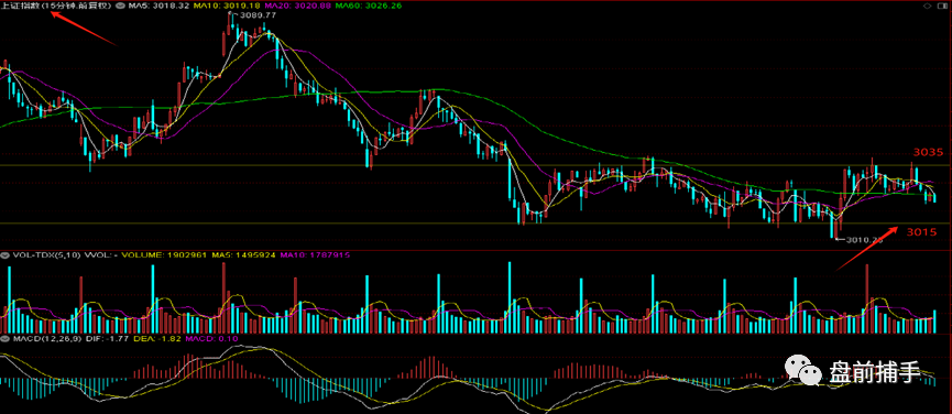 昨天大盤指數衝高回落,從15分鐘圖很明顯看出這幾天大盤圍繞3015-3035區間震盪。明天觀察前低3015——3010點支撐,若跌破,則尋求3000點左右支撐大關。