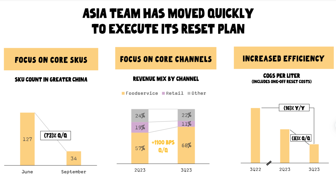 在市場層面,“集中火力辦大事”的亞洲團隊在原有SKU儲備基礎上,將重點放在了那些利潤最高、最能被更高效製造的產品上。例如,隨着“提升計劃”的逐步落地,餐飲渠道的佔比快速上升,第三季度餐飲業務佔比達68%,環比第二季度升高1100個基點。
