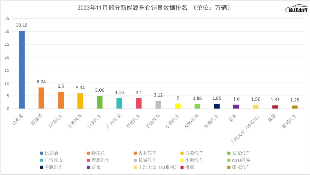 2023年11月部分新能源車企銷量數據排名,數據來源於乘聯會,連線出行製圖
