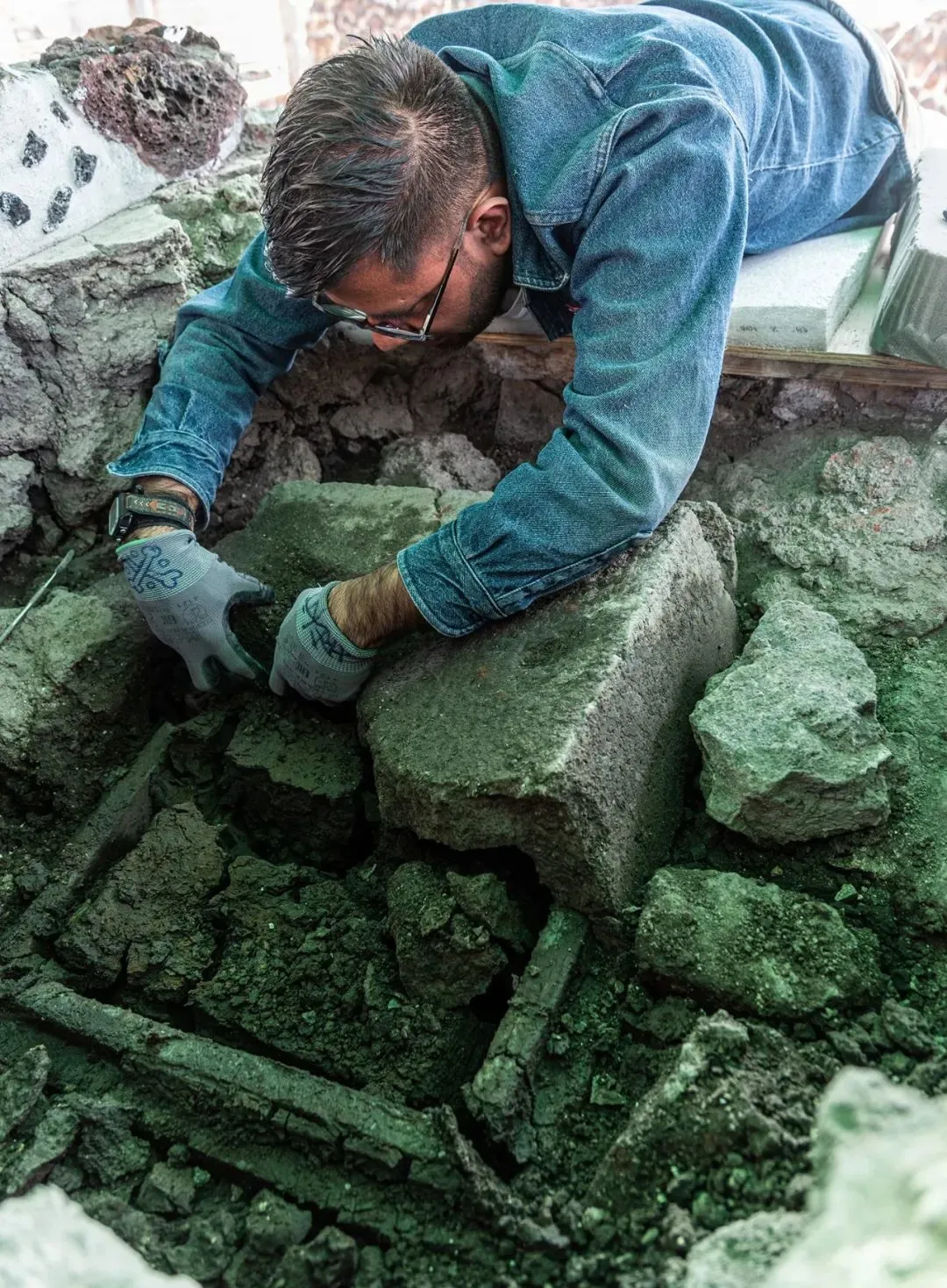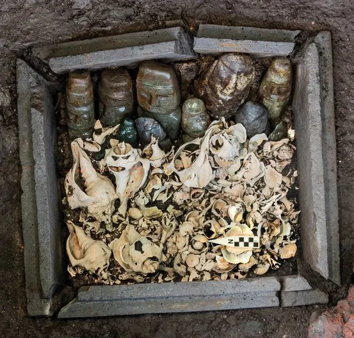 考古學家在大神廟挖掘時發現了一個納瓦特爾語稱為 tepetlacalli 的石盒。在箱子裏,他們發現了15個保存完好的由蛇紋石製成的人像,以及阿茲特克象徵水和肥沃的象徵,如海沙、一對響尾蛇形狀的權杖、數百顆綠巖珠以及貝殼、蝸牛和珊瑚。發現石盒的地層可追溯到公元1454年。15 世紀中葉,蒙特祖瑪一世大力擴張阿茲特克帝國,墨西加人征服了該地區。那時,莫斯卡拉文化早已消失,但墨西加人非常珍視他們的文物,甚至挖掘古代遺址,尋找莫斯卡拉雕塑。在大神廟中發現了的莫斯卡拉雕像,其中一些在被阿茲特克人掠奪時已有 1000 多年的歷史,是從大約200英里外被帶到特諾奇蒂特蘭的,人像被小心翼翼地排列在石盒內,面朝南。