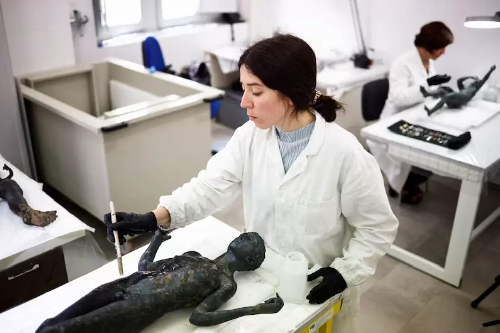 文物工作者在修復考古出土的青銅器