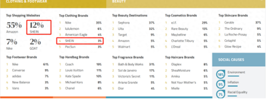 如果被問到最喜歡哪個中國品牌,大多數美國年輕人投出的答案是“SHEIN”。根據美國研究機構Piper Sandler公佈的最新調研結果,SHEIN位居最受美國年輕人歡迎的購物網站第二位,以及美國年輕人歡迎的服裝品牌榜單第四名。