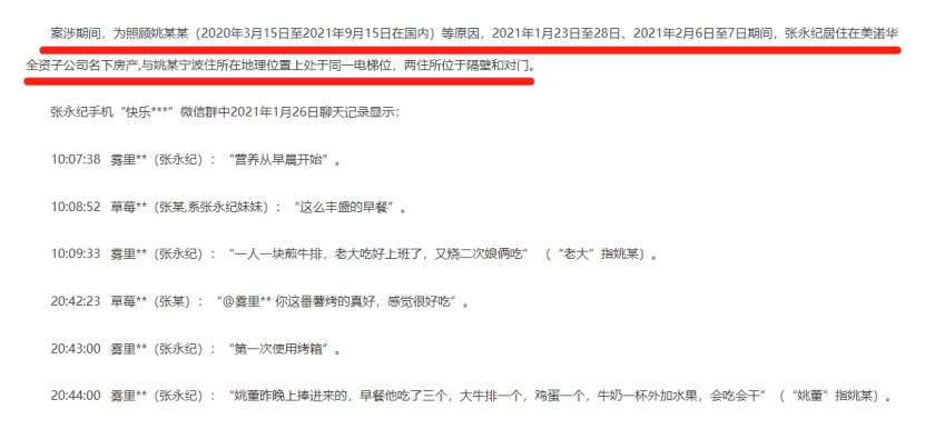 案涉期間,為照顧女兒(2020年3月15日至2021年9月15日在國內)等原因,2021年1月23日至28日、2021年2月6日至7日期間,張某居住在美諾華全資子公司名下房產,與姚某寧波住所在地理位置上處於同一電梯位,兩住所位於隔壁和對門。