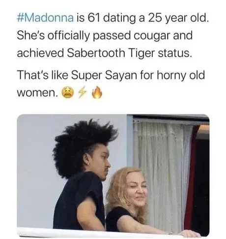 這是61歲的麥當娜約會25歲男孩。她早已過了美洲獅的階段直接到劍齒虎的地位。