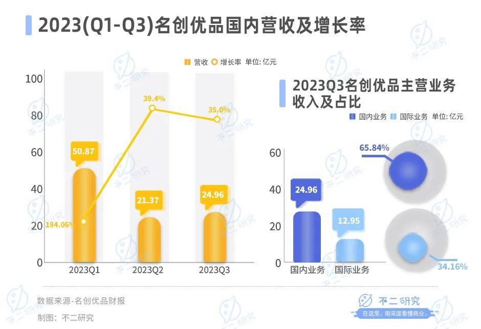 從營收結構看,名創優品2023年Q3國內業務實現營收24.96億元,同比增長34.7%,佔營收比例為65.84%;國際業務實現營收12.95億元,同比增長40.8%,佔營收比例則為34.16%。