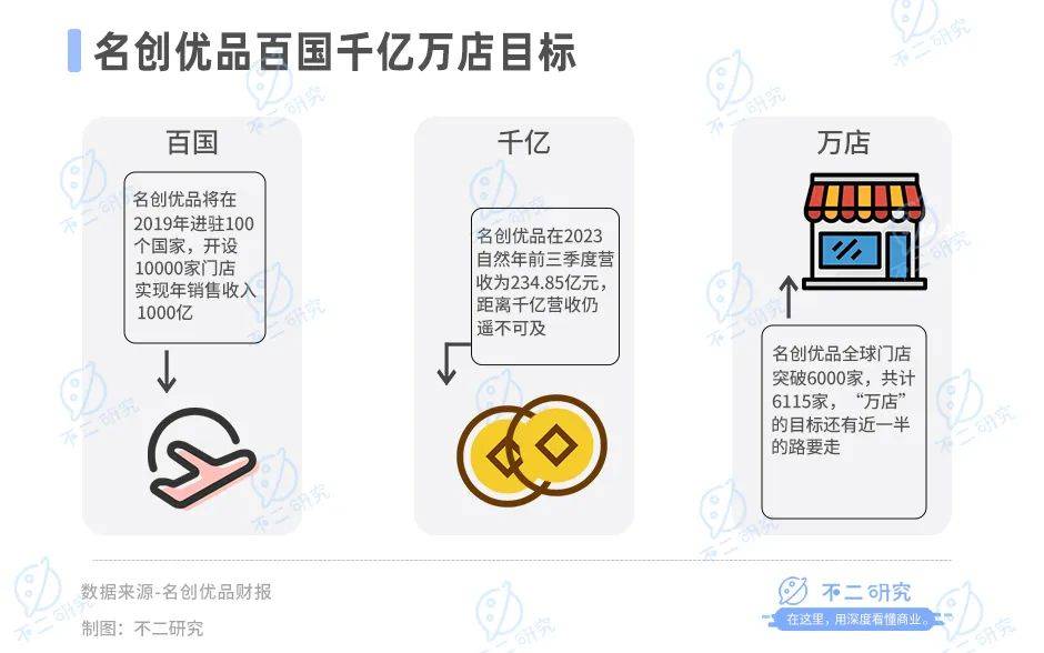 2017年,野心勃勃的葉國富曾稱“名創優品將在2019年進駐100個國家,開設10000家門店,實現年銷售收入1000億”。