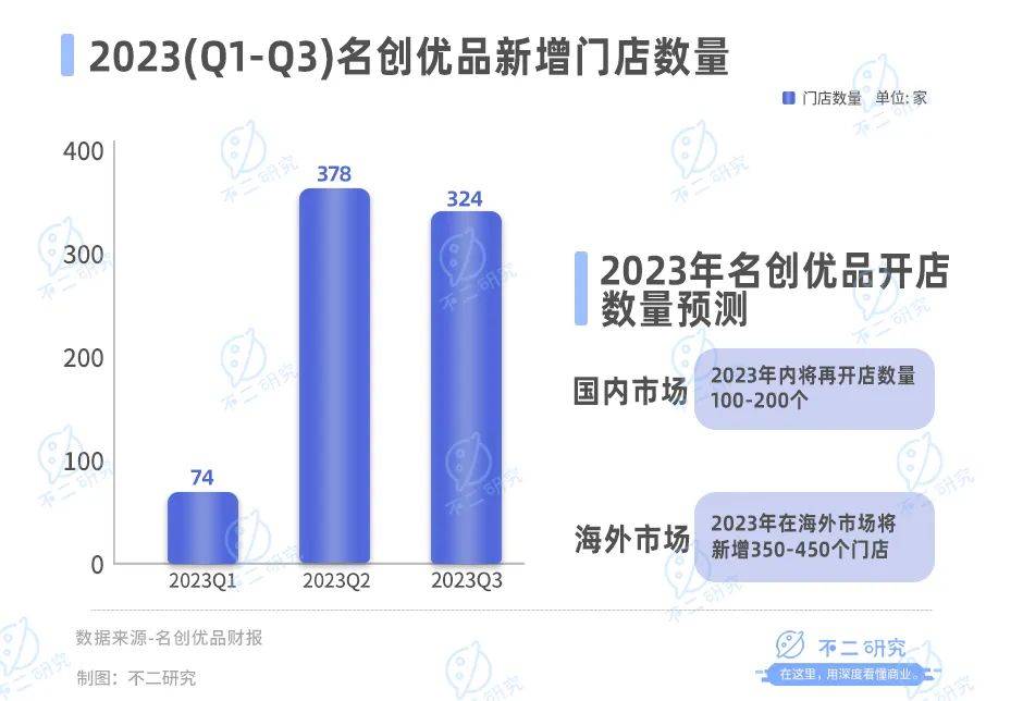 從開店速度看,2023年QI-Q3名創優品分別新增門店74家,378家,324家,據名創優品財報預測,其在2023年內將再淨開100-200個新店;此外,名創優品預計2023年在海外市場將新增350-450個門店。