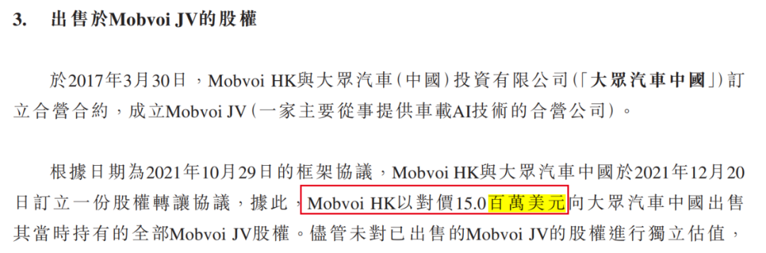 就在大眾汽車撤股的同時,出門問問將雙方的合營公司Mobvoi JV 50%股權以1500萬美元全部出售予大眾汽車中國。