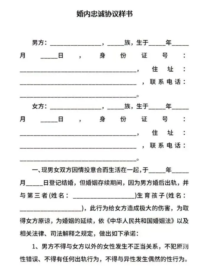 “忠誠協議”,是指男女雙方在婚前或婚後,自願制定的有關在婚姻存續期間夫妻雙方恪守《民法典》婚姻家庭編所倡導的夫妻之間互相忠實的義務。如果違反,過錯方將在經濟上對無過錯方支付違約金、賠償金、放棄部分或全部財產的協議,現實中還有以保證書、“空牀費”等形式存在。