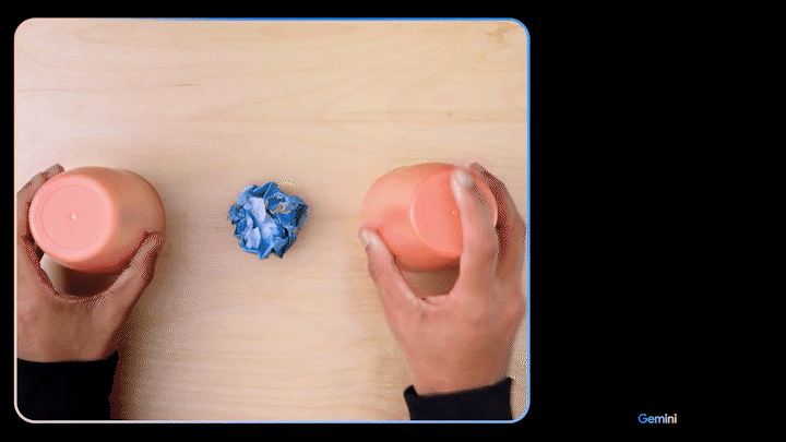 演示剛開始,測試人員就和Gemini玩起了“街頭雜耍”,將一個紙球放進三個杯子裏,然後不停的變換,最終,讓Gemini猜紙球在哪個杯子裏,不出意外,它猜對了。