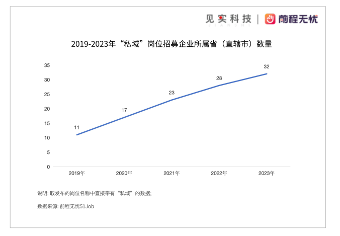 廣東省、 深圳市、 上海市、 浙江省、 江蘇省、 湖北省、 北京市、 四川省、湖南省、 雲南省排在前十。2023 年, 甘肅省、 內蒙古、 山西省、 西藏, 這些地域的企業較往年加大了招募私域崗位的數量。