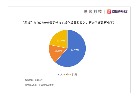 見實在同期針對近800家品牌商家展開了另一項行業調研。調研結果顯示,61.4%的品牌商家表示在2023年私域帶來的轉化效果和收入更大了。