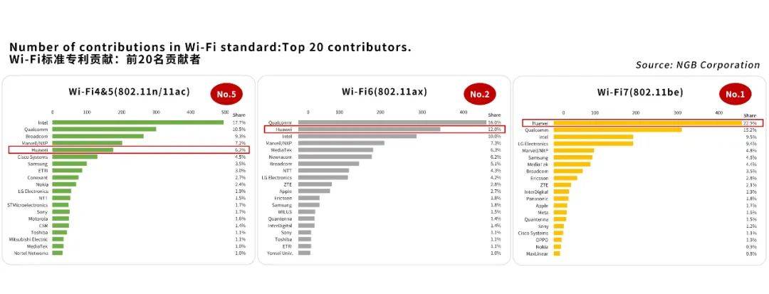 據NGB的統計顯示,Wi-Fi 7標準專利前20名貢獻中,華為以22.9%的佔比位列全球第一,專利貢獻達到482項,是第二名的1.5倍。