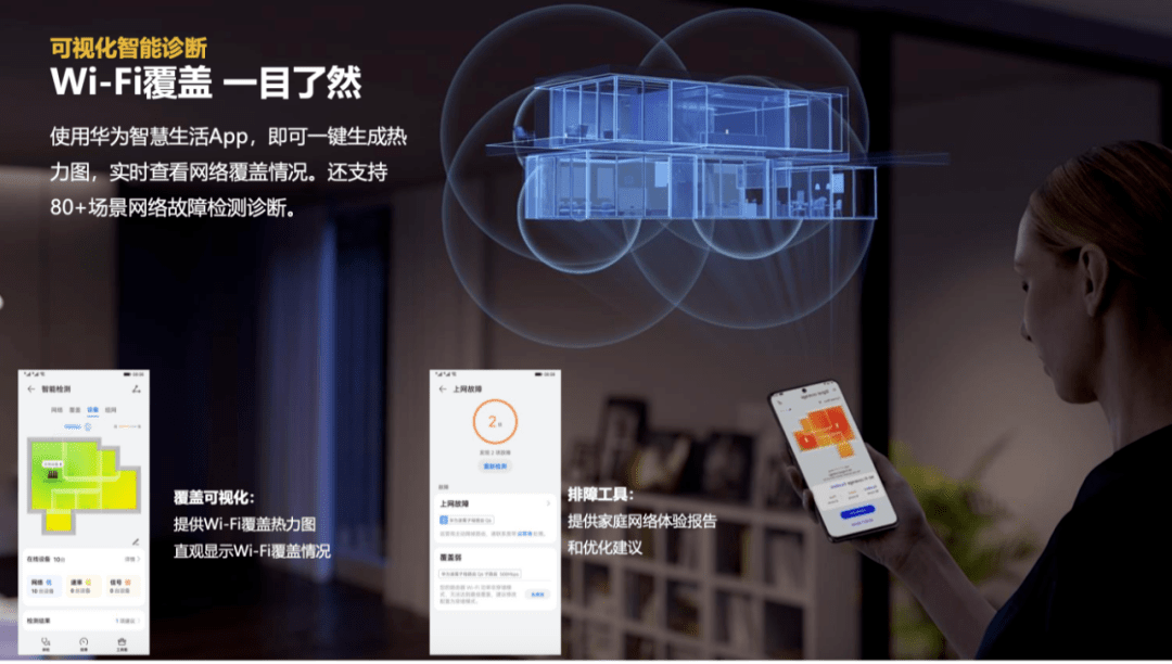 華為路由 BE3 Pro提供了可視化的智能診斷服務:通過生成“Wi-Fi覆蓋熱力圖”,用户可在華為智慧生活APP上直觀實時地看到網絡信號覆蓋情況;通過對78種常見故障的歸納,提供可以自動找出“網絡病灶”的自檢測工具,用户可自行輕鬆解決80%以上的常見故障。