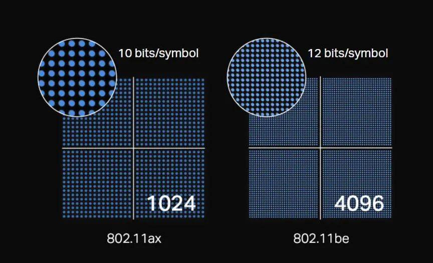 第三個關鍵詞是高速率,包括4096 QAM 高階調製等技術。不管是移動通信還是無線網絡,速率都是標準更新迭代的重頭戲,是普通用户習慣性關注的看點,Wi-Fi 7標準下自然也不例外。