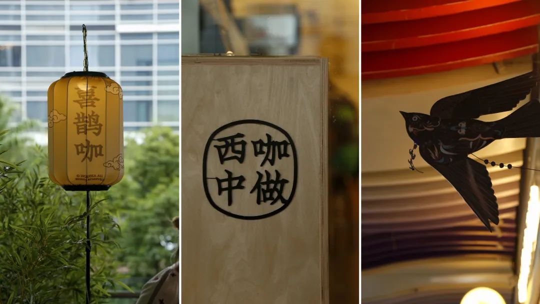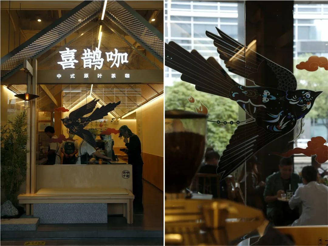 正門玻璃上有一隻剪紙風格的喜鵲裝飾,十分醒目。門口停着一輛黑色的咖啡車,上面擺着黑色中式摺扇。車旁邊豎立了一盞燈籠,印着祥雲和“喜鵲咖”字樣,30平米左右的門店營造出中式庭院的感覺。