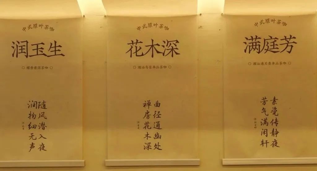 比如,大面積留白的牆上,印着白居易“無由持一碗,寄與愛茶人”的詩句,並搭配綠植造景,很有中式園林的氛圍。