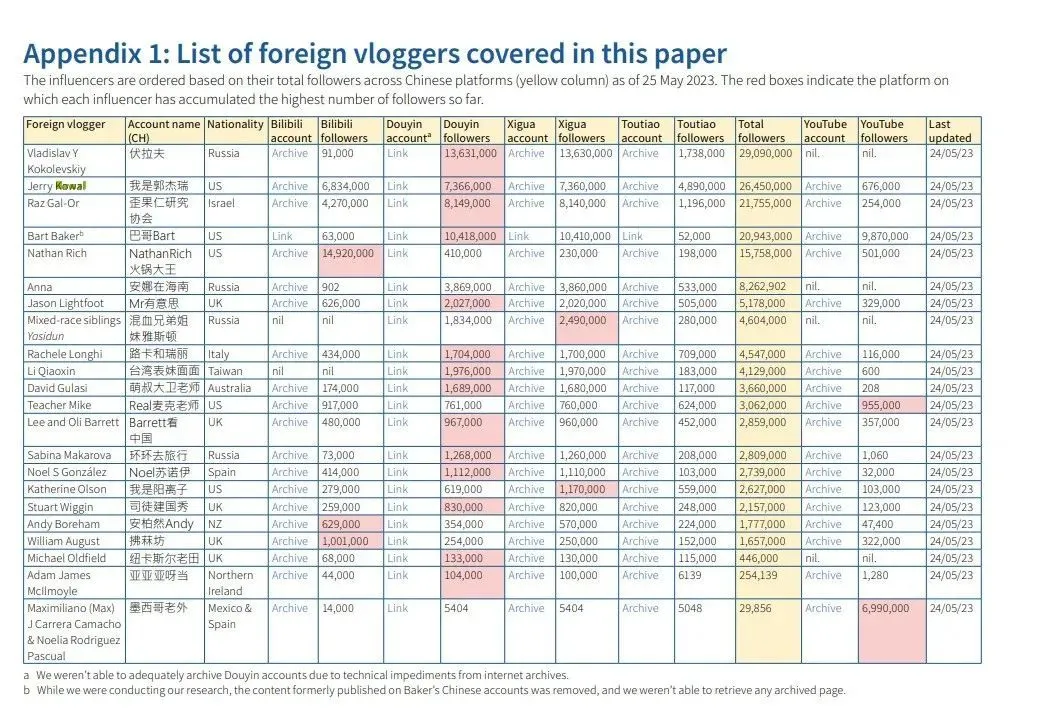 此外,文中還提到了高佑思、安柏然等其他在中國知名度較高的外國網紅,並在附錄中詳細列舉出了他們的賬號名稱和在不同平台的粉絲數。報告聲稱,這些網紅在中方的引導下逐漸壯大,成為用來對抗西方敍事的意見領袖。