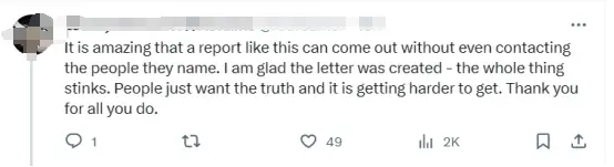 “令人驚訝的是,這樣一份報告甚至可以在沒有聯繫研究對象的情況下發表。我很高興你能寫這封公開信——整件事糟透了。人們只想知道真相,而真相卻越來越難得到。謝謝你所做的一切。”