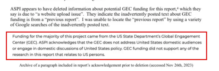 最初,這份於11月24日發佈的報告致謝中有註明,該項目的大部分資金來自美國國務院的全球參與中心(GEC),但ASPI隨後秘密刪除了報告的這一部分。