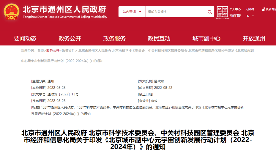 2022年2月23日,北京市通州區人民政府辦公室制訂併發布《關於加快北京城市副中心元宇宙創新引領發展若干措施》,大力推進示範應用,全面優化產業佈局,鼓勵發展早期和長期投資,加強知識產權保護和標準創制,給予元宇宙企業房租財政補貼,發揮多方產業組織力量,支持人才及團隊引進,加強國際交流合作是國內最早發佈相關相關政策的區級行政單位。