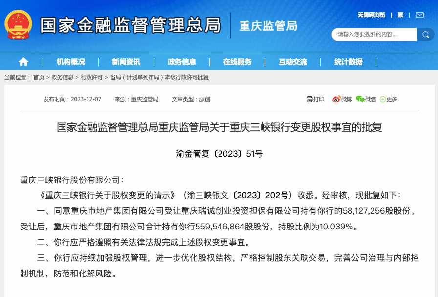 12月7日,國家金融監督管理總局重慶監管局發佈公告,同意重慶市地產集團有限公司受讓重慶瑞誠創業投資擔保有限公司持有三峽銀行的約5812.73萬股股份。受讓後,重慶市地產集團有限公司合計持有重慶三峽銀行約5.6億股股份,持股比例為10.039%。