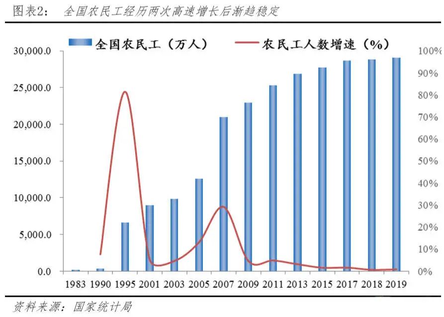 2003年,國務院頒佈《關於做好農民進城務工就業管理和服務工作的通知》,提出取消對農民工進城務工的就業的不合理限制,推動了農民工數量的快速攀升。