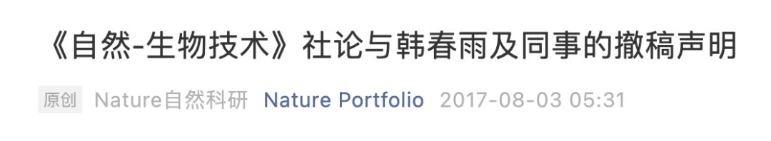 韓春雨的論文發表後不久,來自全世界各國的科學家陸續表示實驗不可重複。一年後,韓春雨及其團隊主動撤回了這篇論文。