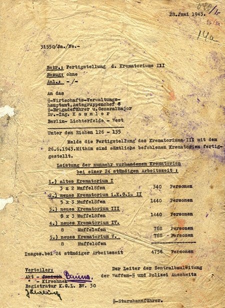 先從主要文檔開始,你要知道,就像歷史學者一樣,使用該時期有效的主要來源來確認信息。下面的圖片是奧斯維辛集中營建設負責人(黨衞軍突擊隊大隊長卡爾比紹夫)發往柏林(黨衞軍高級大隊長、土木工程負責人漢斯卡姆勒)的電報,這份文件詳細介紹了1943年6月之前完成的5個新火葬場的建設情況。